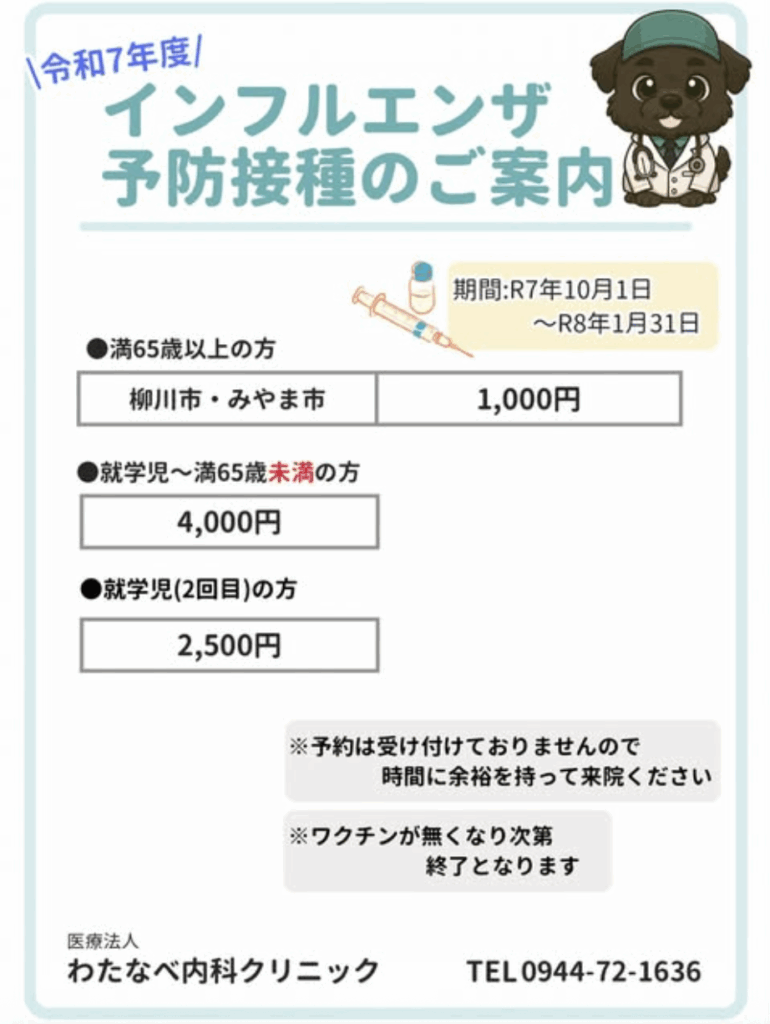R7年度 インフルエンザ予防接種のご案内💉 ご不明点等ありましたら、お気軽にお電話下さい♪